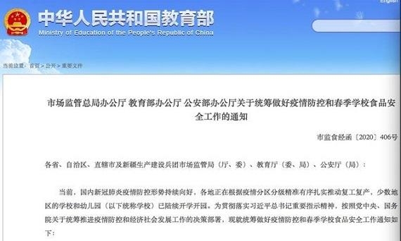 三部门发文,统筹做好疫情防控和春季学校食品安全工作